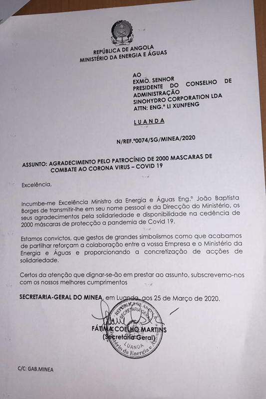 當(dāng)?shù)貢r(shí)間4月24日,中國(guó)電建安哥拉代表處收到來自中國(guó)駐安哥拉大使館的表揚(yáng)信,信中高度贊揚(yáng)了中國(guó)電建安哥拉代表處在安哥拉進(jìn)入國(guó)家緊急狀態(tài)的疫情期間,克服困難,對(duì)使館各項(xiàng)水電設(shè)備維修維護(hù)工作高度重視,多次選派專業(yè)技術(shù)人員前往使館協(xié)助檢修維護(hù),為使館在疫情期間的正常秩序提供了有效保障。表揚(yáng)信對(duì)中國(guó)電建“自強(qiáng)不息,勇于超越”的企業(yè)精神風(fēng)貌和社會(huì)責(zé)任感給予了肯定,并感謝中國(guó)電建對(duì)使館工作一如既往的支持。